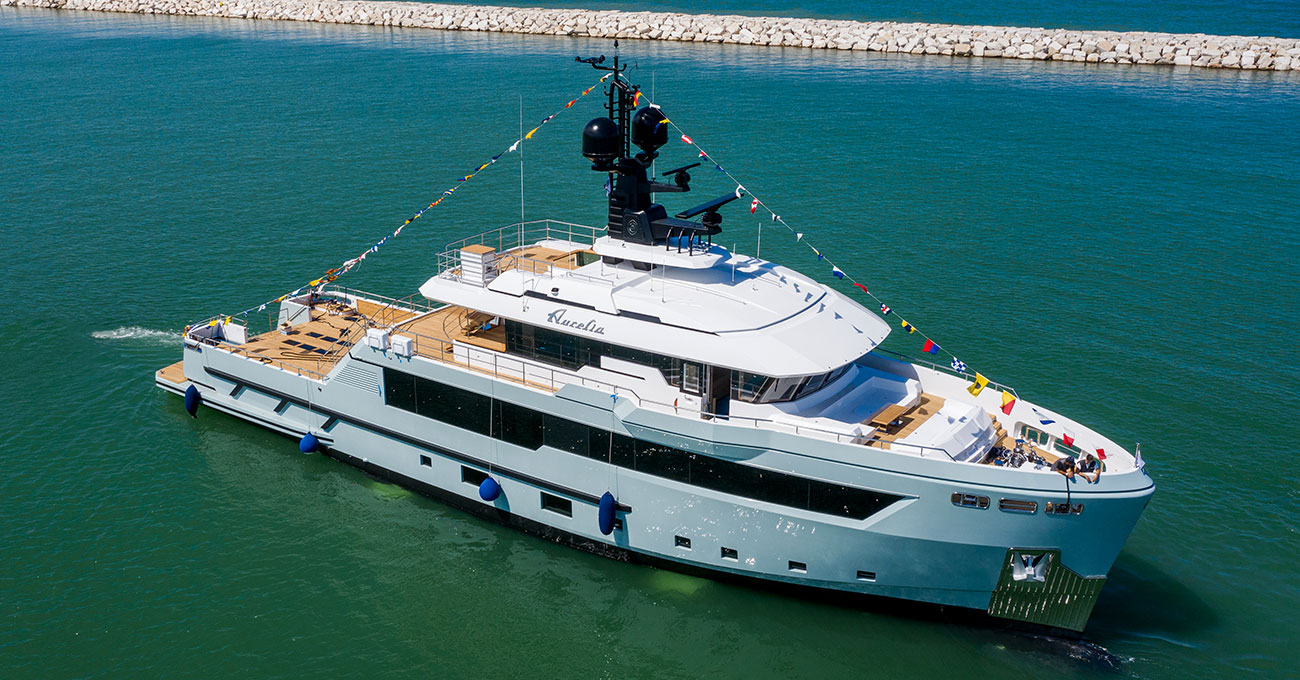 At 39.37m and with a beam of 8.60m, Aurelia has a displacement of 392t. Powered by twin