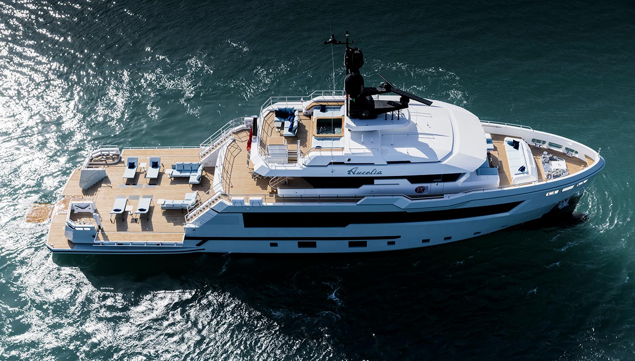 At 39.37m and with a beam of 8.60m, Aurelia has a displacement of 392t. Powered by twin Caterpillar C32