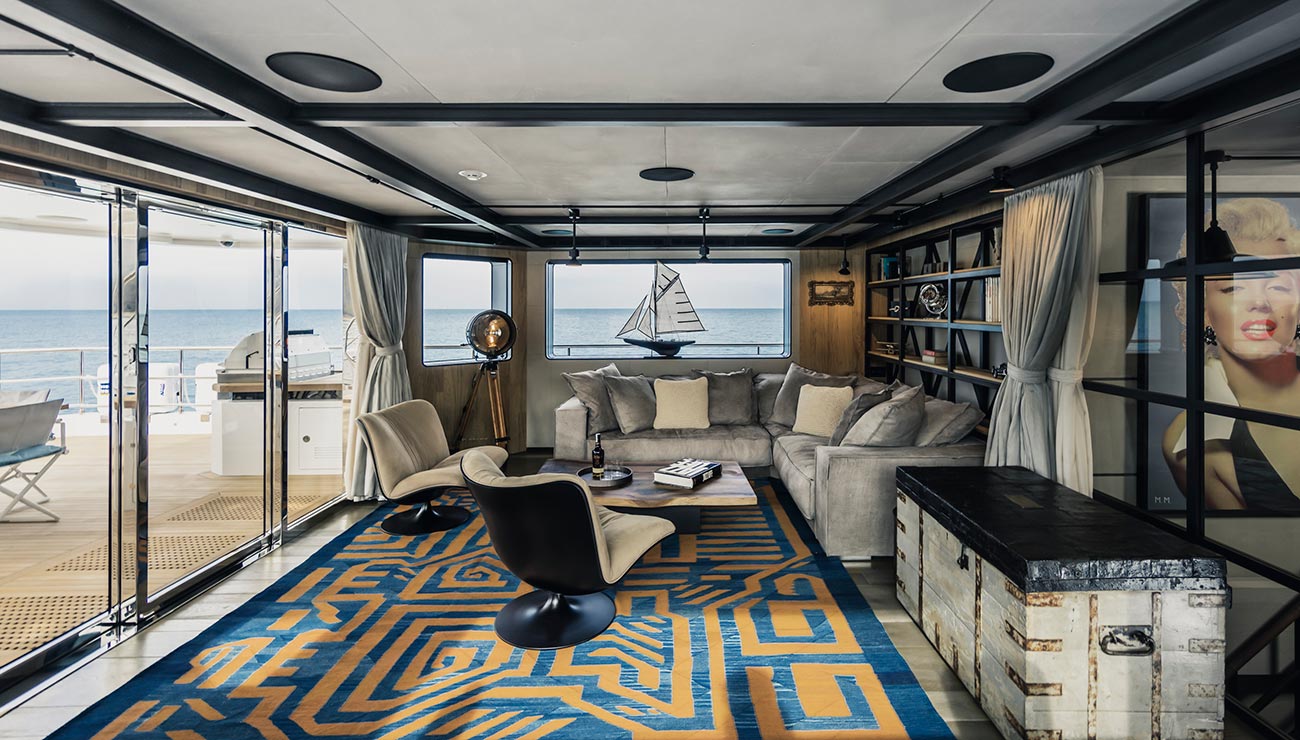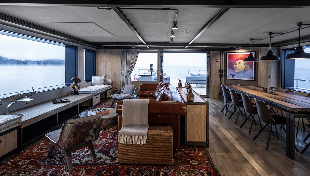 the sea through large side windows. Her bold hull boasts a custom Star Green livery by Alexseal Yacht Coatings.