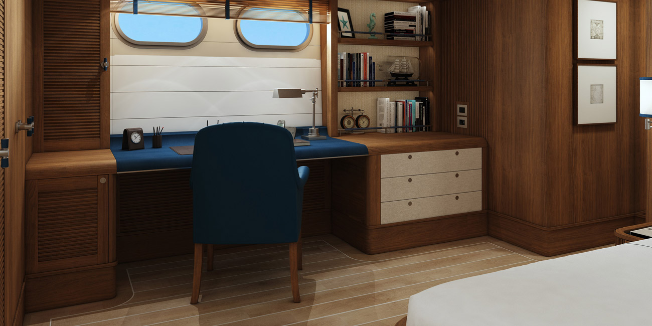 The Owner’s full beam stateroom is located on the Lower deck amidships, followed by two twin cabins with pullman bed. A VIP suite occupies the furthest forward section of the full. Crew quarters for four members are located on the Main deck forward alongside a sizable crew mess, and directly connected to the wheelhouse on the Upper deck via a dedicated staircase.