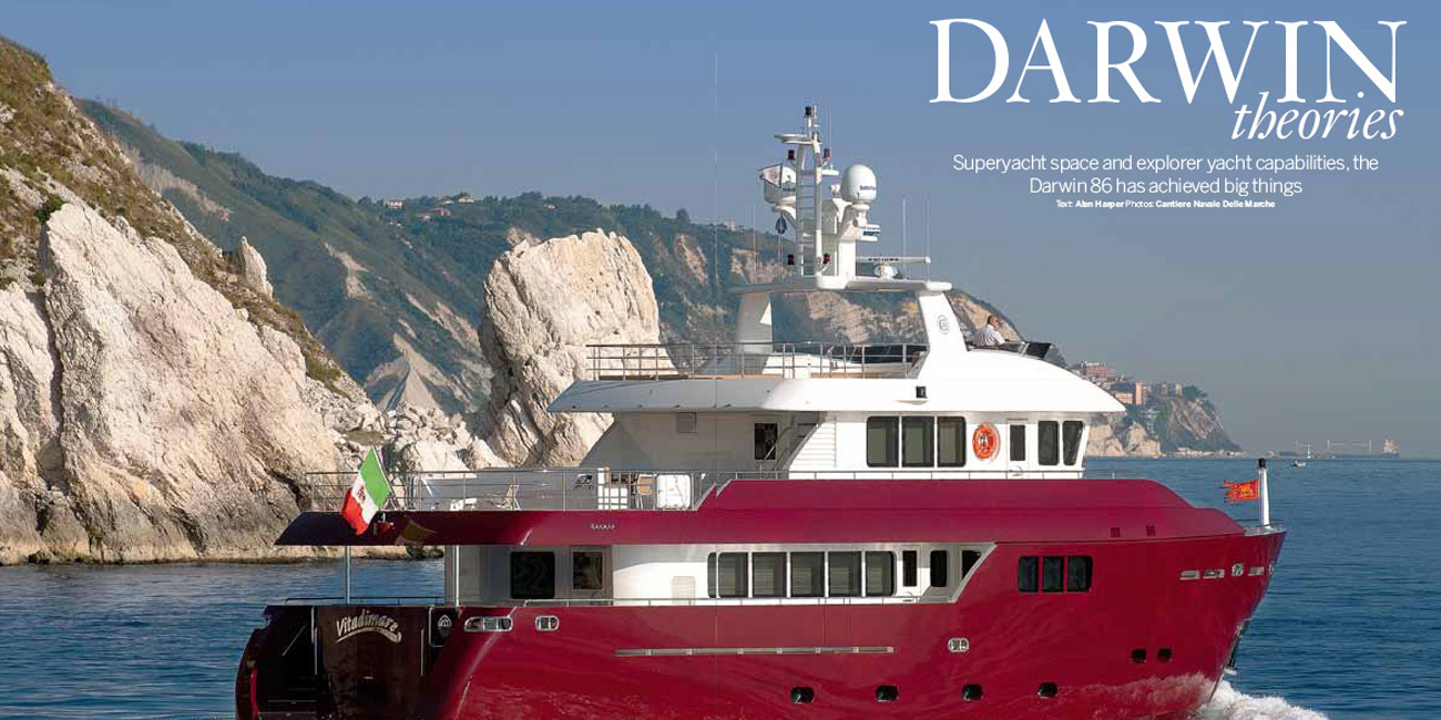 Nothing is quite what its seems with Darwin. This new 86 might look like a cross between a tug and a trawler, but it has more in common with a superyacht than most vessels this size can claim. Its steel hull and aluminium superstructure are faired to the micron and polished to perfection. It sits in the water like the Rock of Gibraltar, immovably displacing nearly 200 tonnes. Everything about the big, pro-spec wheelhouse says you’re on a 130-footer, except that in order to see the bow, you have to walk to the windscreen and look down. The company that builds it is also surprising. Occupying swish new waterfront premises in the shipbuilding town of Ancona, on Italy’s Adriatic coast, Cantiere delle Marche only came into being in August last year. But already they have designed a range of motor yachts of between 75 and 115ft and claim to have sold five of them, the first of which, Vitadimare, was delivered to its proud Venetian owner in June. While the second, its construction long under way, is scheduled for launch in February.