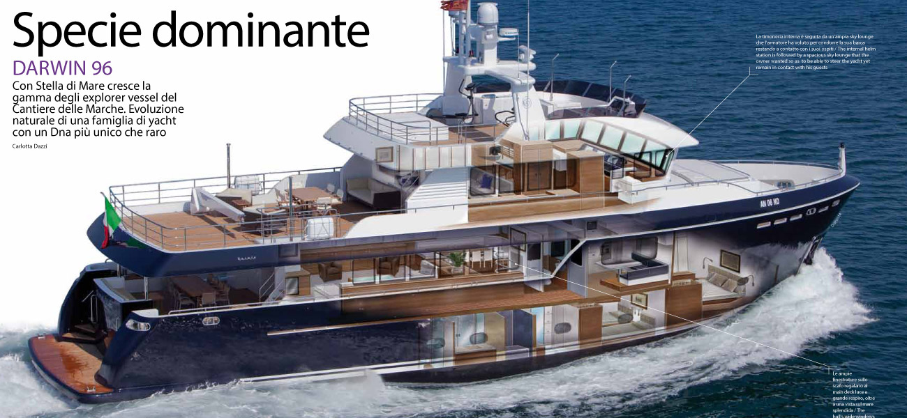 The Cantiere delle Marche continues to do its bit for Darwinian theory with the launch of its new 30-metre, the aptly-named Darwin 96 Stella di Mare, the latest addition to its highly successful expedition yacht range. Splashed just five months ago, the new arrival has already explored the length and breadth of the Mediterranean and is preparing to embark on more challenging exploits beyond the Columns of Hercules as we write, in line with the evolutionary tradition of her predecessor in the range, the Darwin 86. "She retains the intimate elegance and nobility of form of her smaller sister but has more space and an even better spec," says architect Pierluigi Floris who penned the interiors. "There are very clear references to nautical culture of times past as well as other structural elements that set her apart. She has a ship-like steel structure with an aluminium superstructure, a streamlined hull with high gunwales, fluid but extremely marine forms, a generous and well-laid out exterior and interior spaces too." She is designed to tackle even the roughest of seas. Her structures and waterlines are the work of Sergio Cutolo while Pierluigi Floris did her interiors. She brilliantly suited her owners’ requirements on both levels as Vasco Buonpensiere, the Sales Director of the Ancona yard, is eager to point out: "This 30-metre demonstrates the importance of the relationship between the owner and yard very clearly," he told us. "It’s not just a physical thing. It really sets us apart and puts the owner at the heart of our work." Despite having the family feeling of the rest of the Darwin Class Explorer Yachts, Stella Maris has some distinctive design tweaks too. The open sky lounge at helm level, for instance, was designed specifically for the owner who likes to take the wheel himself yet still be able to chat with his guests. The below decks areas are impressive. "Creating a sense of brightness, light and lightness were our guidelines," explains Floris. "The big hull windows meant we were able to create interiors that were open, modern, clean and warm all at once. The elm we used for the interior fit-out, tones ranging from brown to gold, and the white-painted open pore walls intensify the feeling of light." This is an extremely seaworthy yacht designed for long-range cruising of a more in-depth kind than is usual. The interiors speak volumes in that regard, not least the large saloon area which is in constant visual contact with the outside world. Both its lounge and 10-seater dining area exude a sense of oneness with the sea. The galley and dinette act as a divider between this first owner area and the crew quarters (forward on the main deck). A door leads to the upper deck which is laid out as a continuous flow between the helm station and the entertainment lounge, as per the owner’s instructions. The stairs leading to the lower deck end in a lobby off which open four cabins: the full-beam owner’s aft, two twins amidships and a roomy VIP forward. Stella Maris is designed for heavy duty work but the Cantiere delle Marche has made it its mission to ensure its craft are as green as possible. In fact, the new Darwin Class comes with the option of an Azipod diesel-electric propulsion system which also improves its range and manoeuvrability significantly, of course. Truly a species apart.