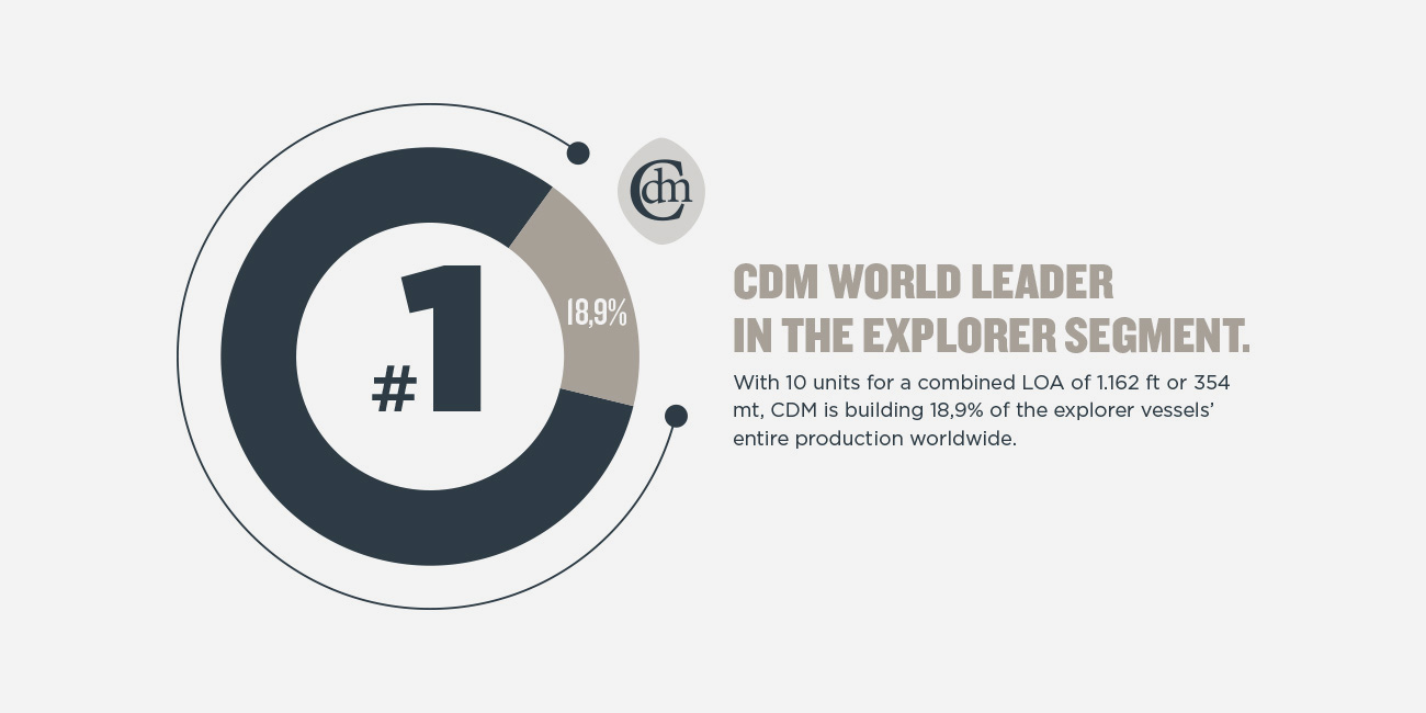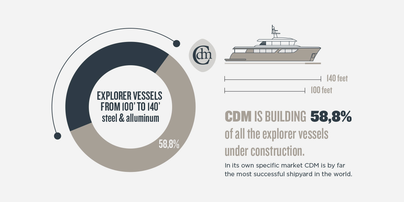 Narrowing down to the 100-140 feet segment in steel and aluminium, Cantiere delle Marche is building an astonishing 58.8% of all explorer vessels currently under construction worldwide.