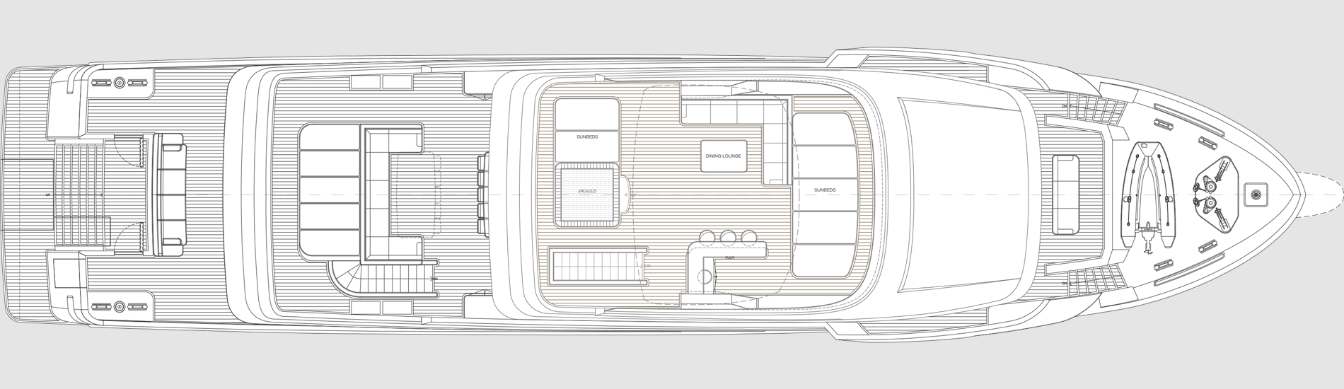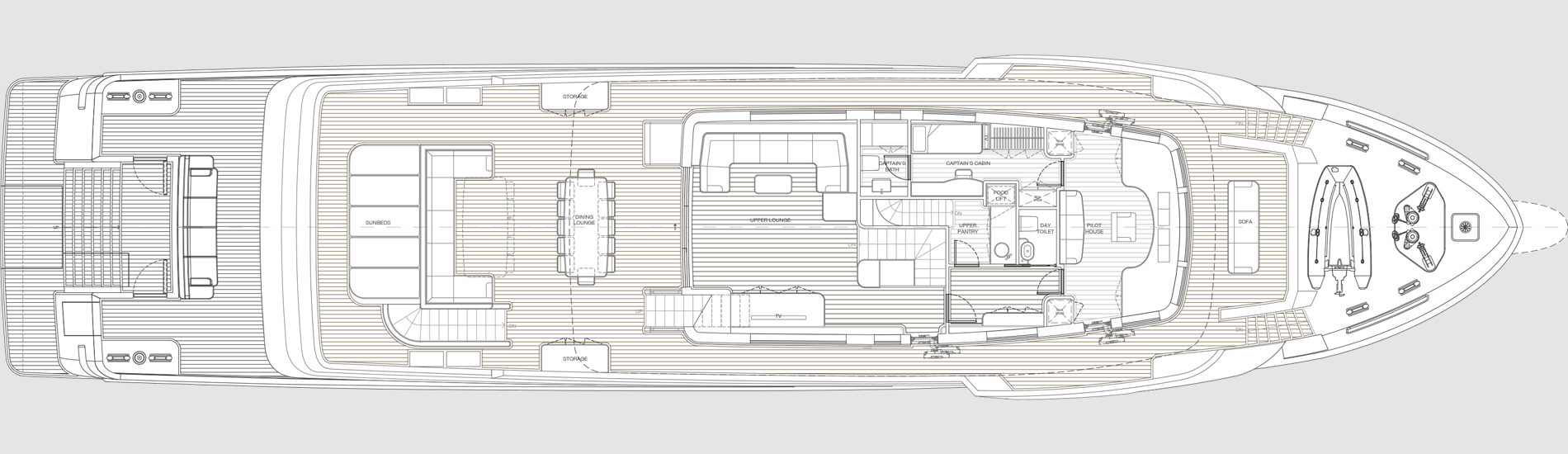 With a length overall of 42 metres and a beam of 8,50 metres, Explorer 40.22 has a displacement at full load of approximately 400 tons. Powered by two Caterpillar C32 Acert delivering 970kW each at 2100rpm, Explorer 40.22 will reach a top speed of 14 knots with a range of 3500nm at 10 knots.