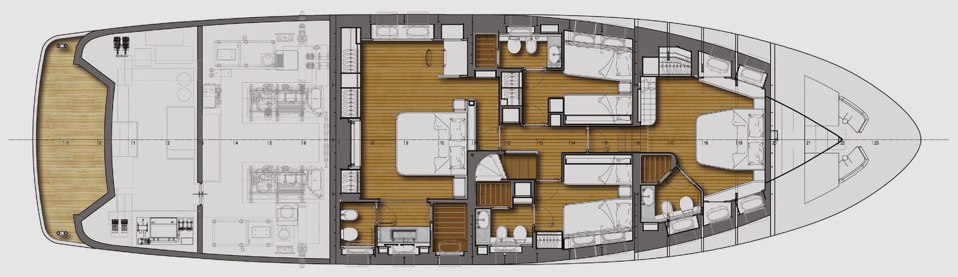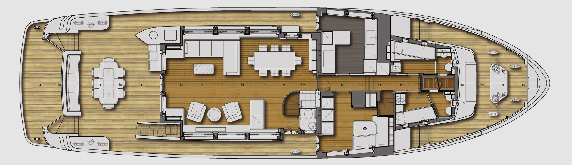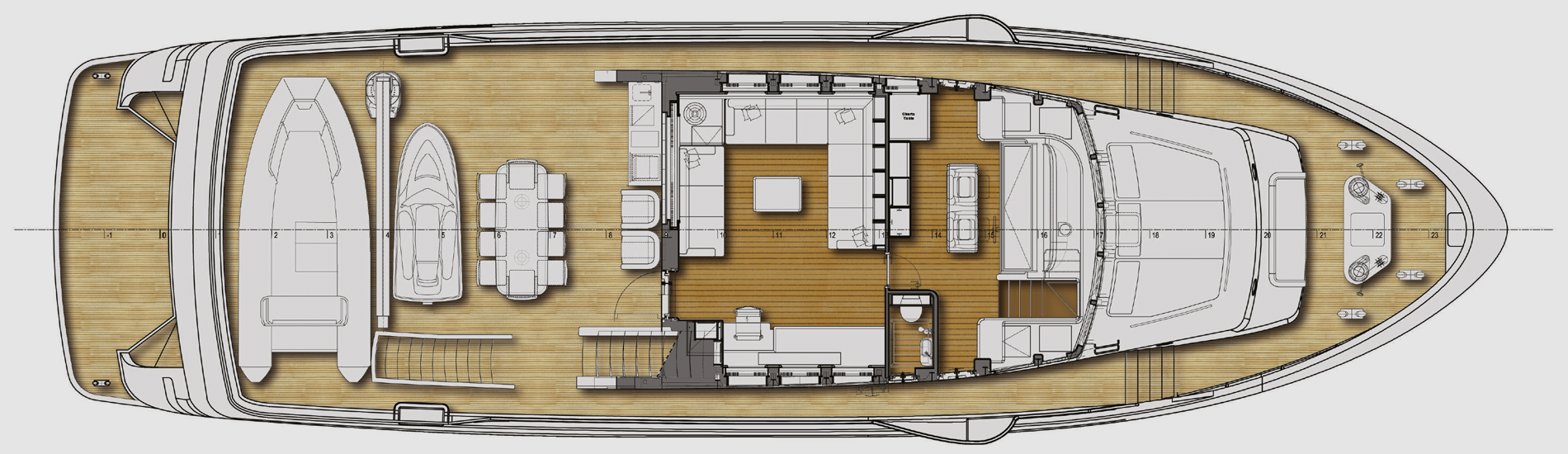 The smallest in the Darwin Class, at just 86 feet (26 metres), is a genuine oceangoing vessel that mirrors the construction standards, equipment and range found in the larger Darwins. It provides comfortable accommodation for both guests and crew even during the most extended journeys. All Darwin 86 delivered up to now have been customized to meet specific preferences and requirements of each owner, resulting in unique features and layouts.