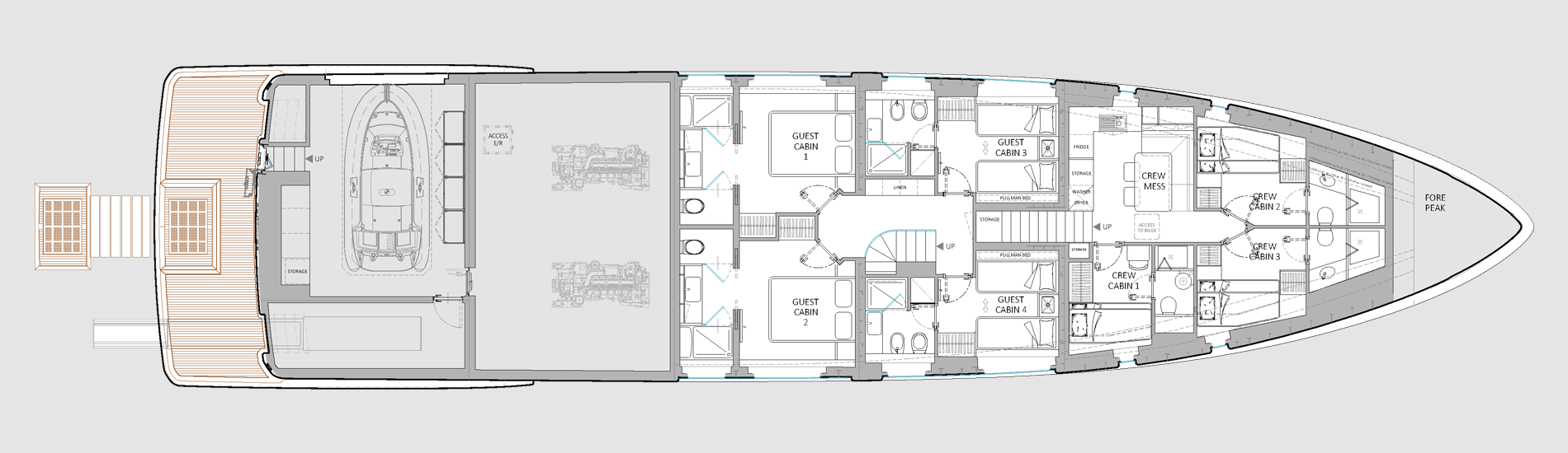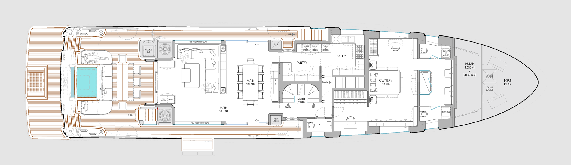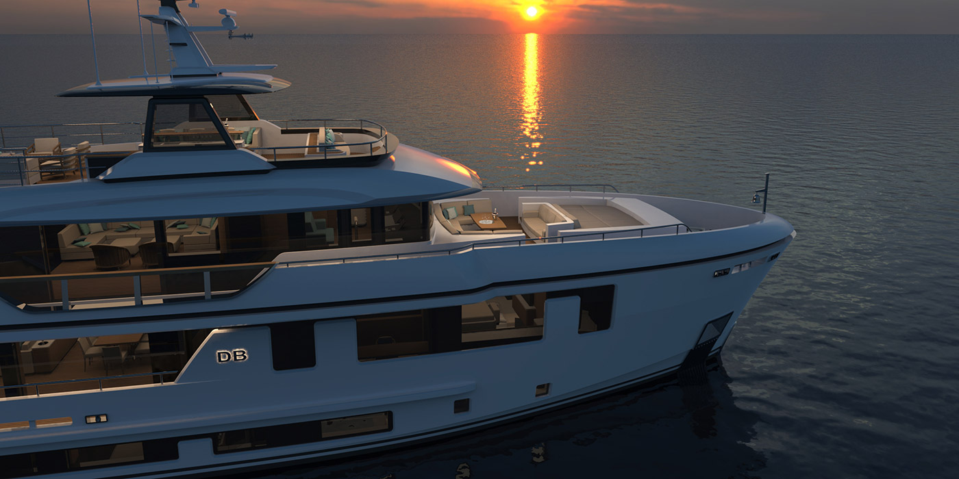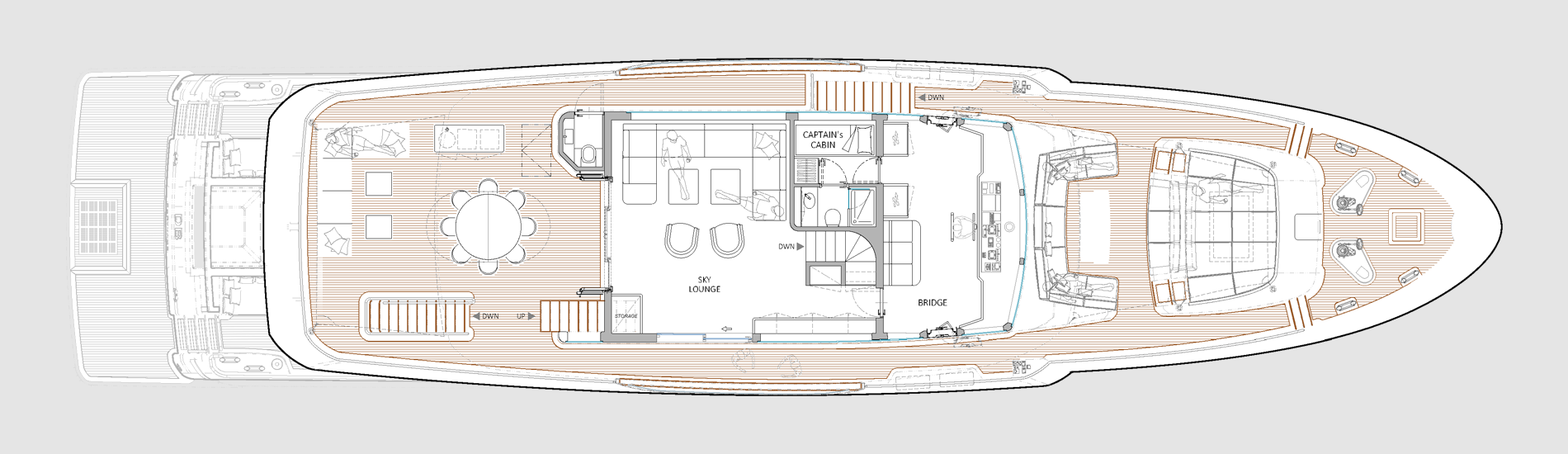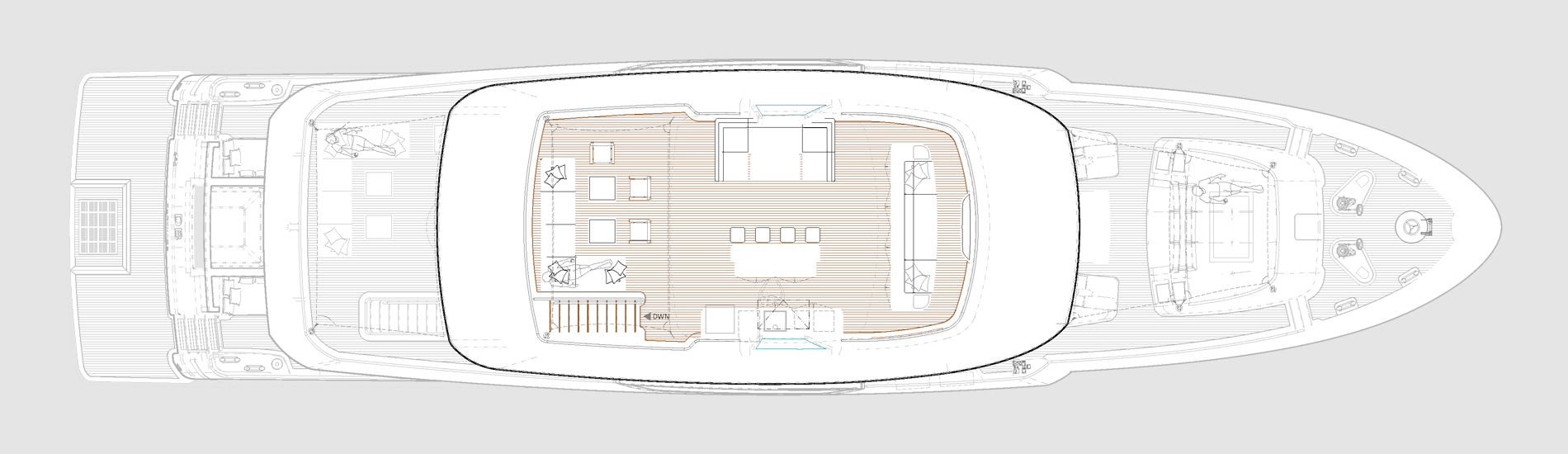 The Deep Blue 115, a genuine explorer yacht for sale in a compact package, mirrors qualities and comfort of the larger models of the line it belongs to. Crafted for extensive navigation, this explorer yacht offers remarkable indoor and outdoor living spaces, ensuring spacious accommodations for Owners, guests, and crew alike. Large openable doors ensure continuity between interior and exterior areas on both the Main and Upper deck creating bright and airy environments.