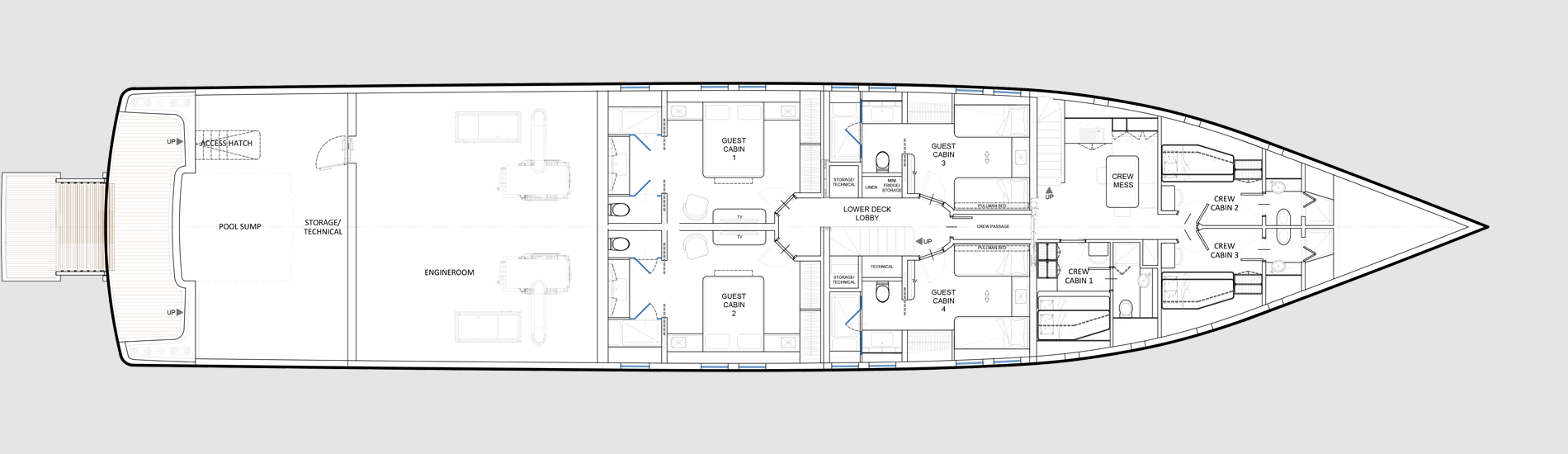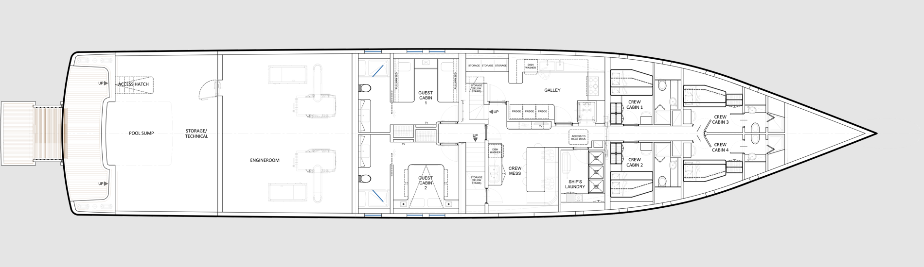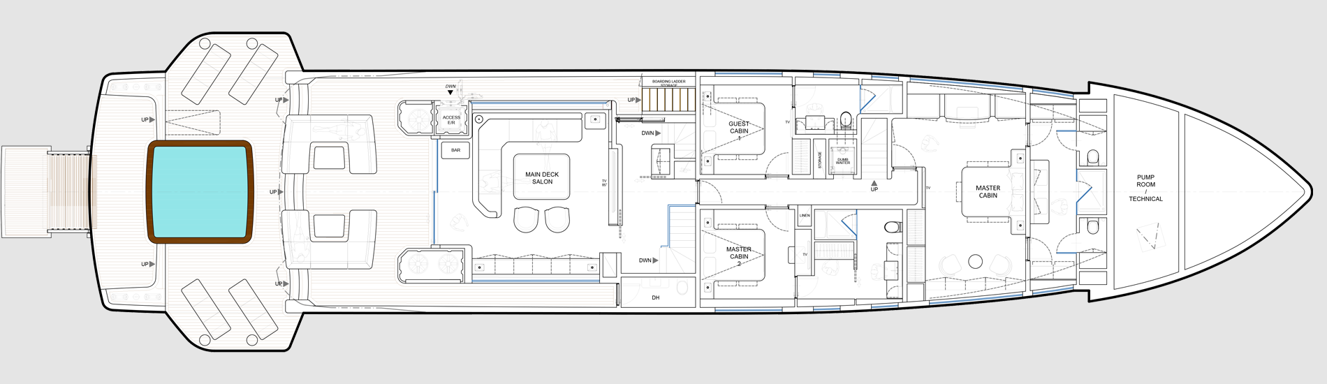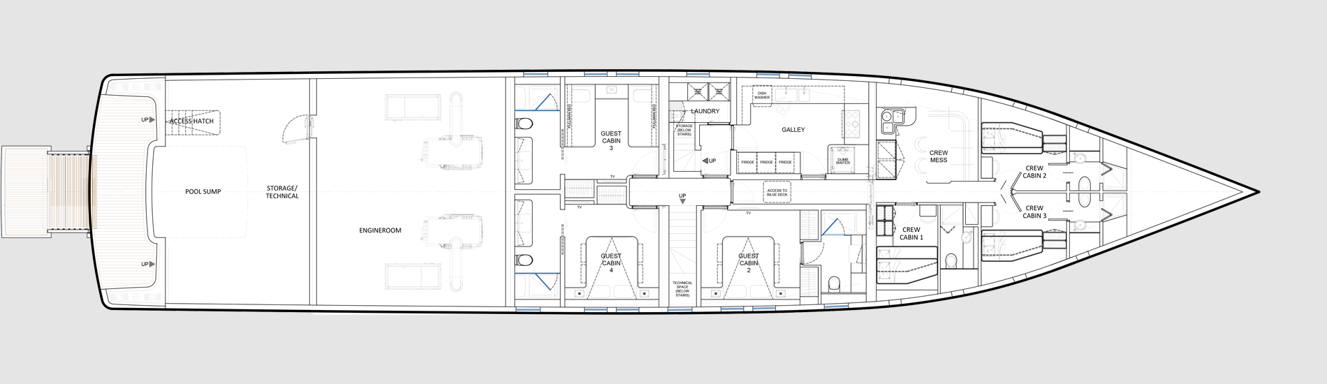 Experience the epitome of style, elegance and versatility with the Deep Blue 130, a true go- anywhere oceangoing vessel. Designed with the utmost consideration for discerning owners, this explorer yacht offers a myriad of customizable configurations and layouts to cater to diverse lifestyles, ensuring unmatched comfort and luxury whether you navigate far and wide in the Med or voyage to the world’s most remote destinations. A ship under all aspects, the Deep Blue 130 offers superb comfort in both private and communal areas coupled with outstanding seaworthiness. The Deep Blue 130 boasts remarkably spacious crew quarters.