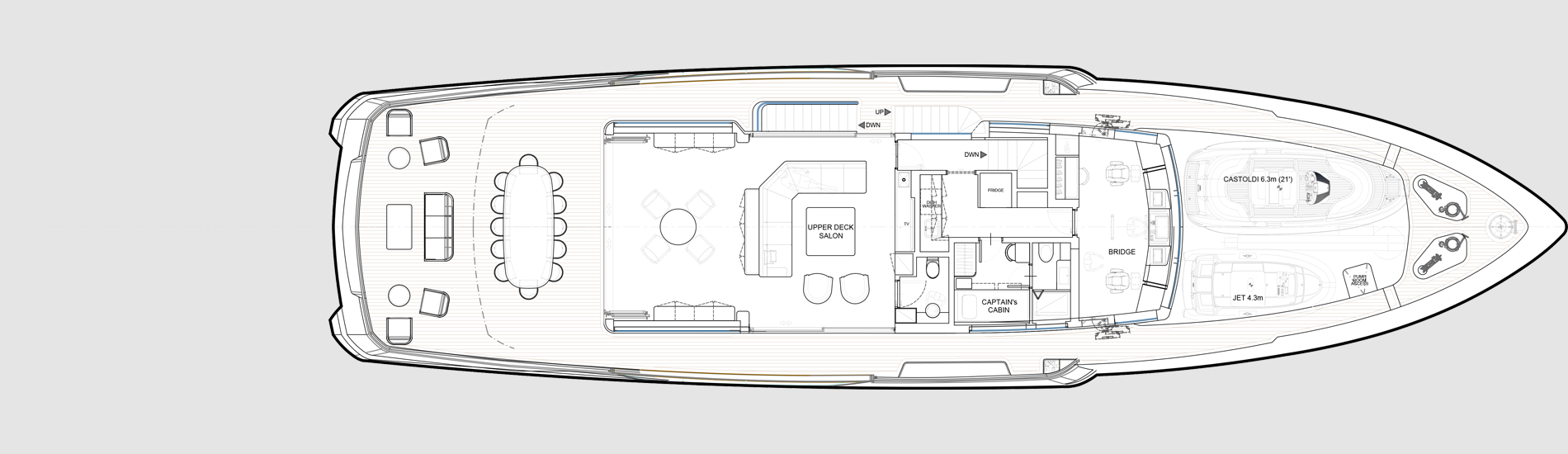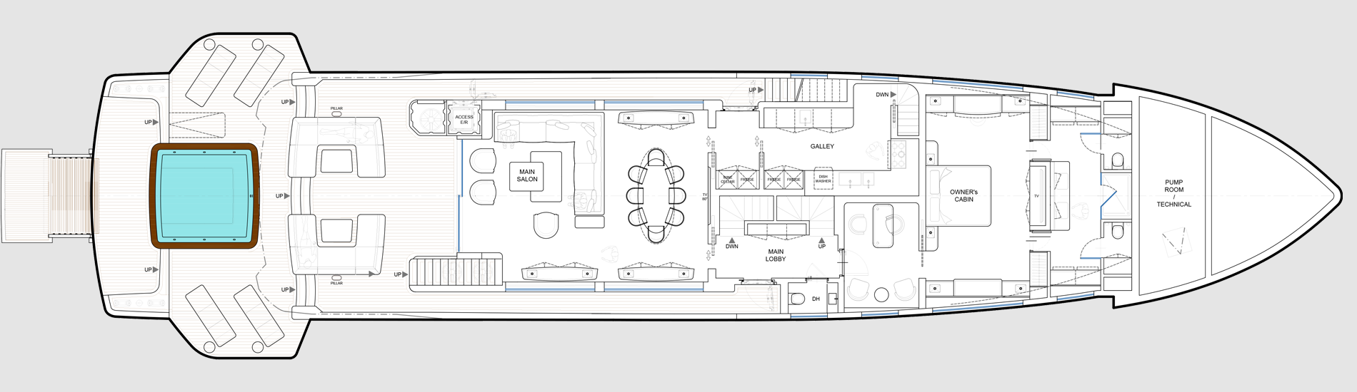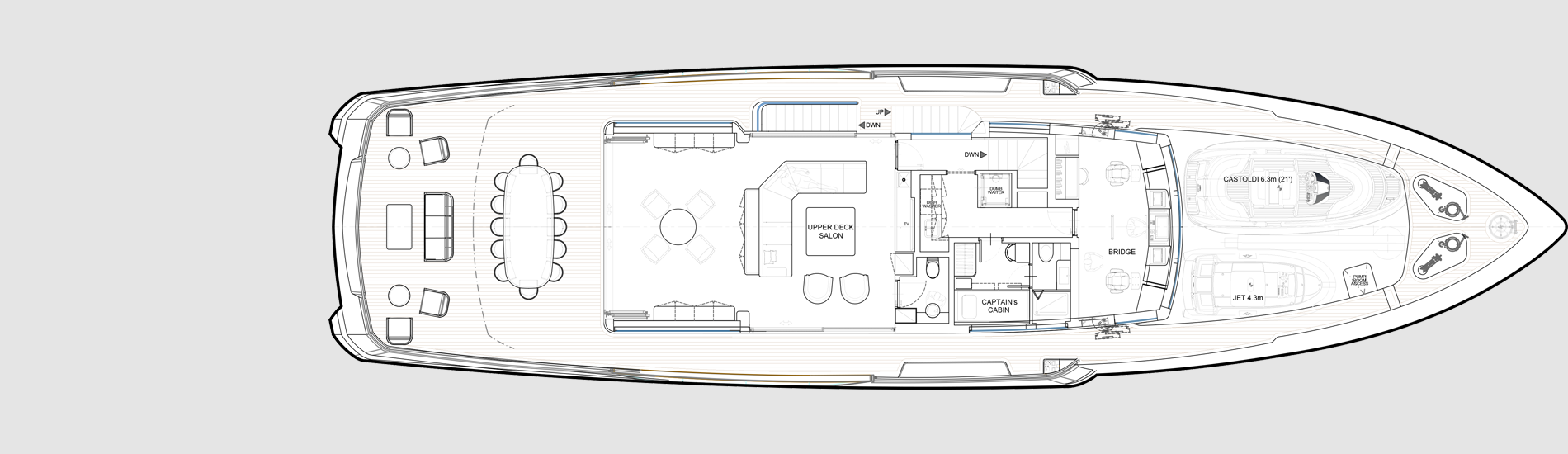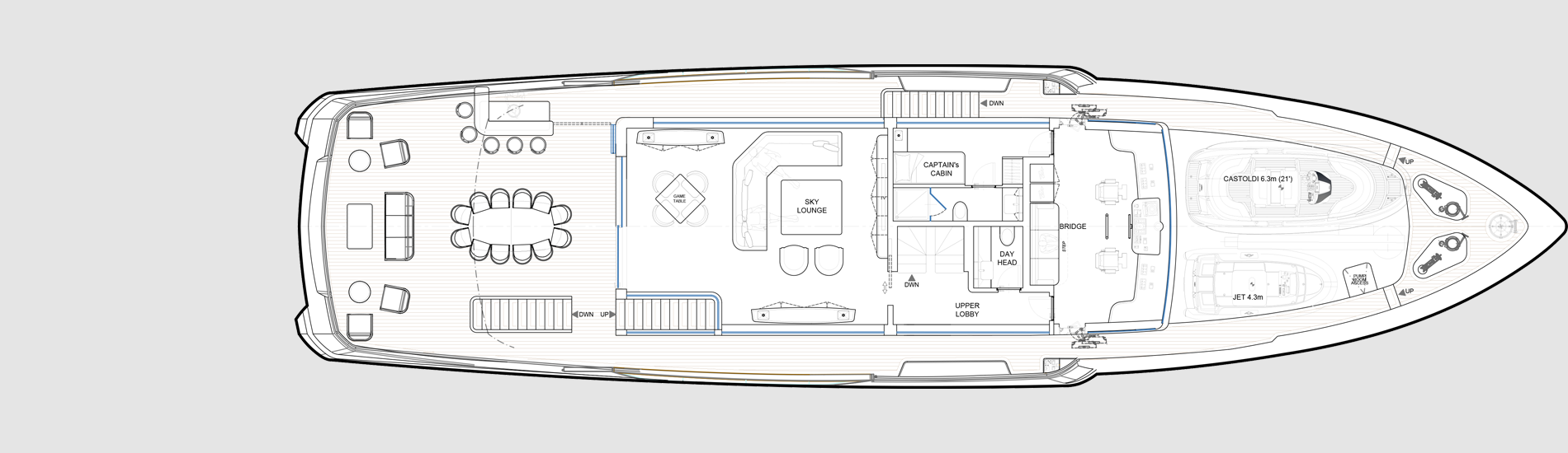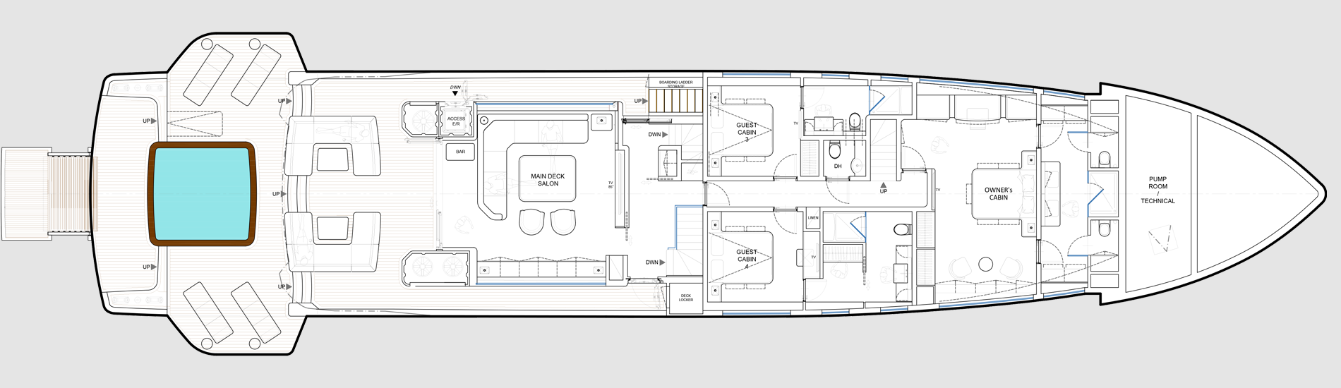 Experience the epitome of style, elegance and versatility with the Deep Blue 130, a true go- anywhere oceangoing vessel. Designed with the utmost consideration for discerning owners, this explorer yacht offers a myriad of customizable configurations and layouts to cater to diverse lifestyles, ensuring unmatched comfort and luxury whether you navigate far and wide in the Med or voyage to the world’s most remote destinations. A ship under all aspects, the Deep Blue 130 offers superb comfort in both private and communal areas coupled with outstanding seaworthiness. The Deep Blue 130 boasts remarkably spacious crew quarters.