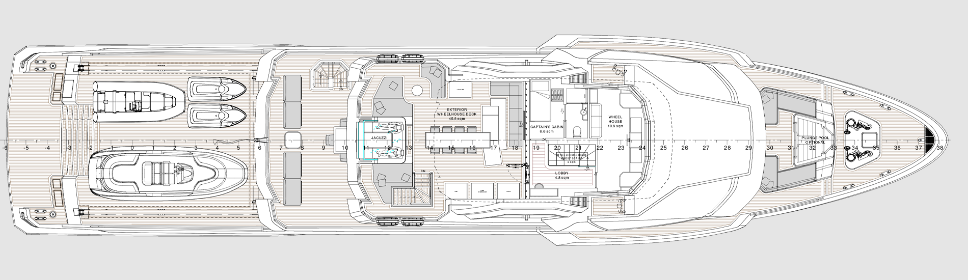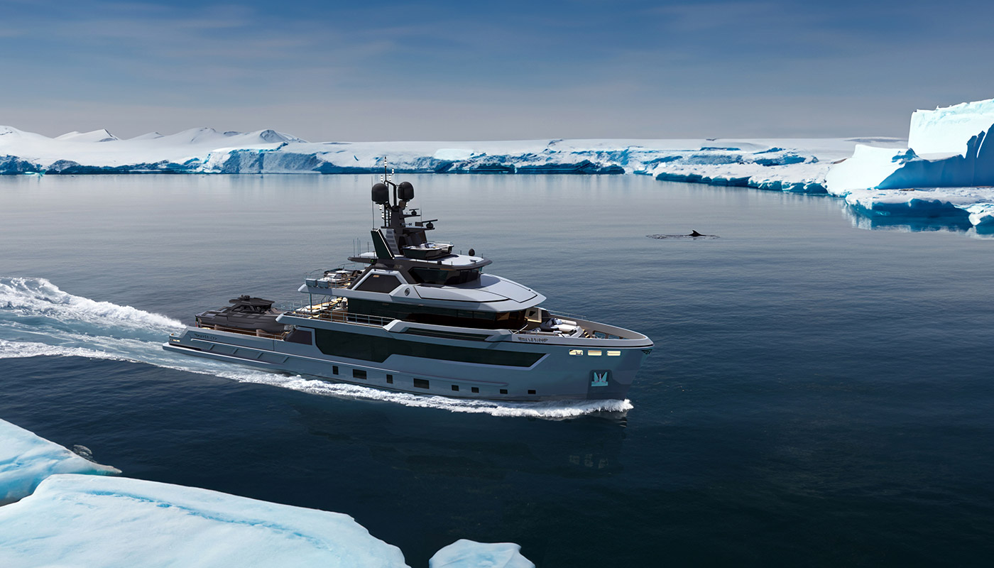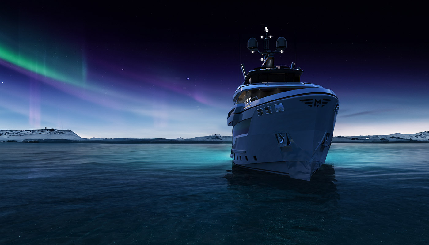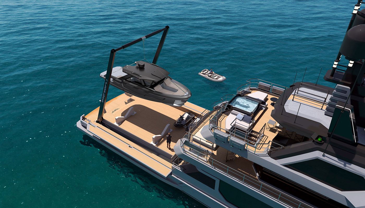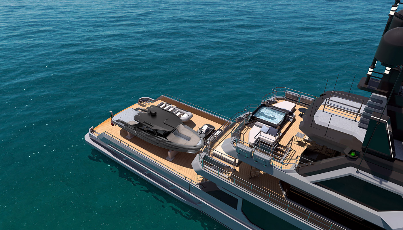 The most imposing model in the Flexplorer line, the Flexplorer 146 four-deck stands as a grand yacht with abundant indoor and outdoor spaces across all decks. Its remarkably flexible layout can be tailored to meet each owner unique requests and lifestyle aboard. Its generous hull and superstructure can host an array of large tenders and water toys, alongside all sort of equipment to enjoy exploration on water, underwater, and on land. At owner’s request it can feature either a powerful A-frame crane with multiple hanging points, or not.