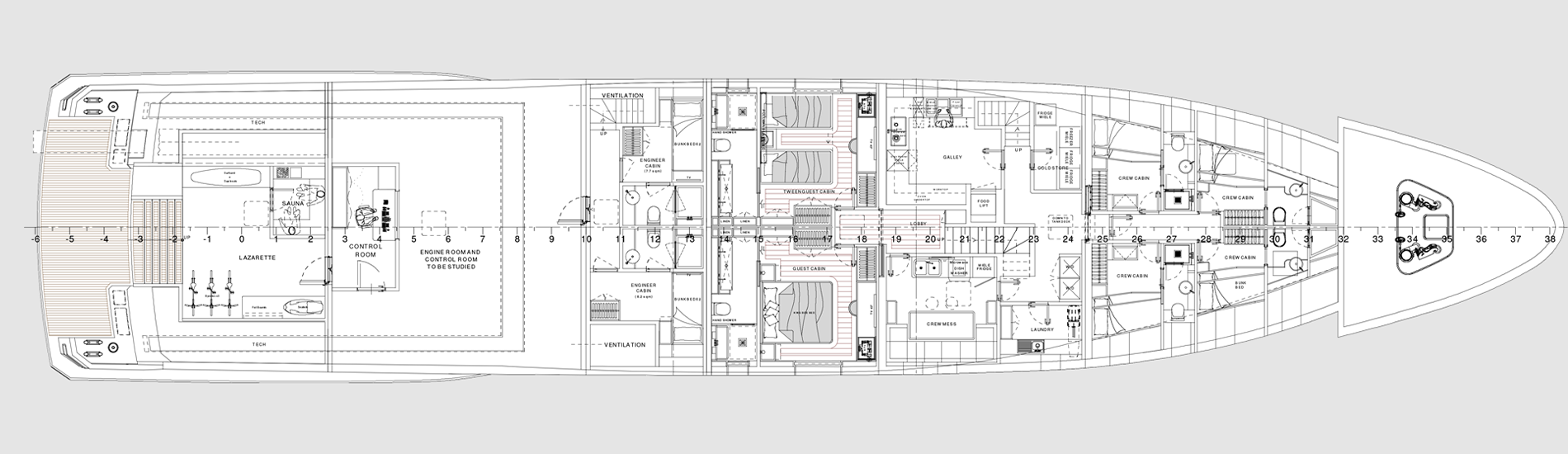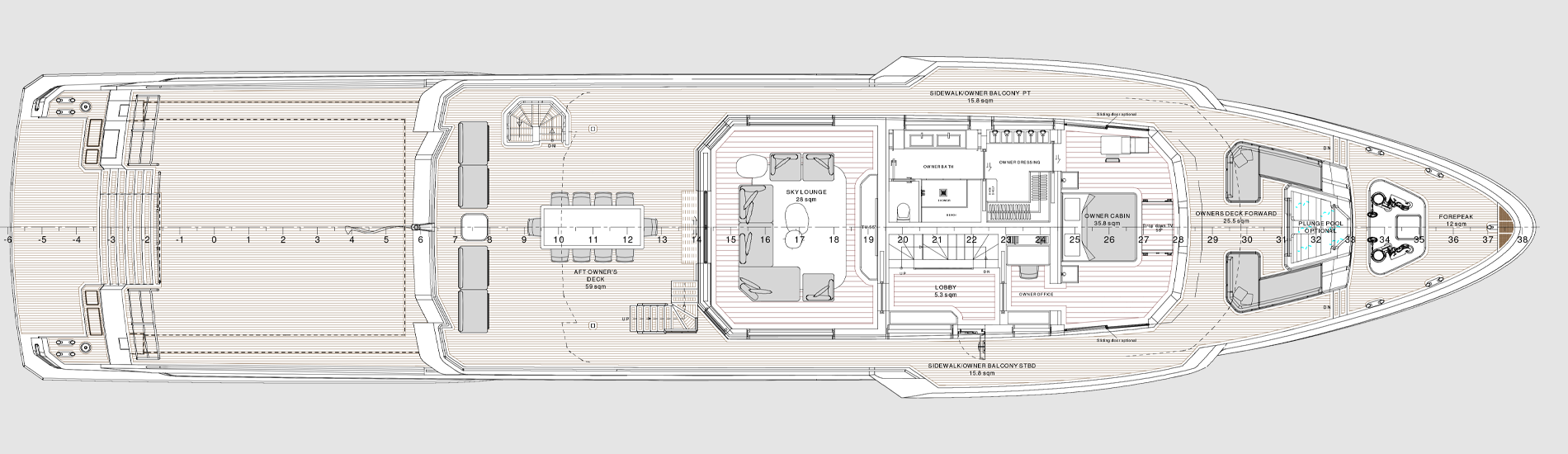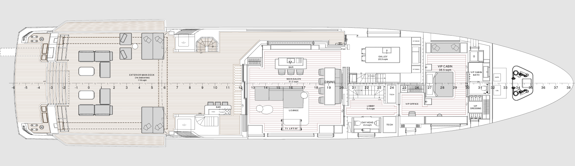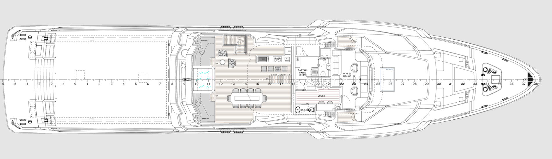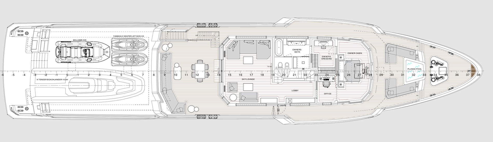 The most imposing model in the Flexplorer line, the Flexplorer 146 four-deck stands as a grand yacht with abundant indoor and outdoor spaces across all decks. Its remarkably flexible layout can be tailored to meet each owner unique requests and lifestyle aboard. Its generous hull and superstructure can host an array of large tenders and water toys, alongside all sort of equipment to enjoy exploration on water, underwater, and on land. At owner’s request it can feature either a powerful A-frame crane with multiple hanging points, or not.