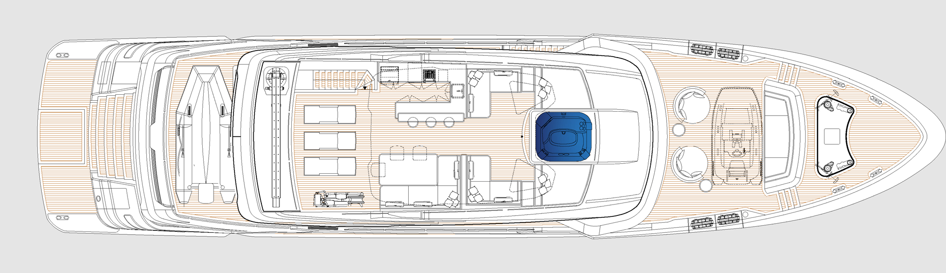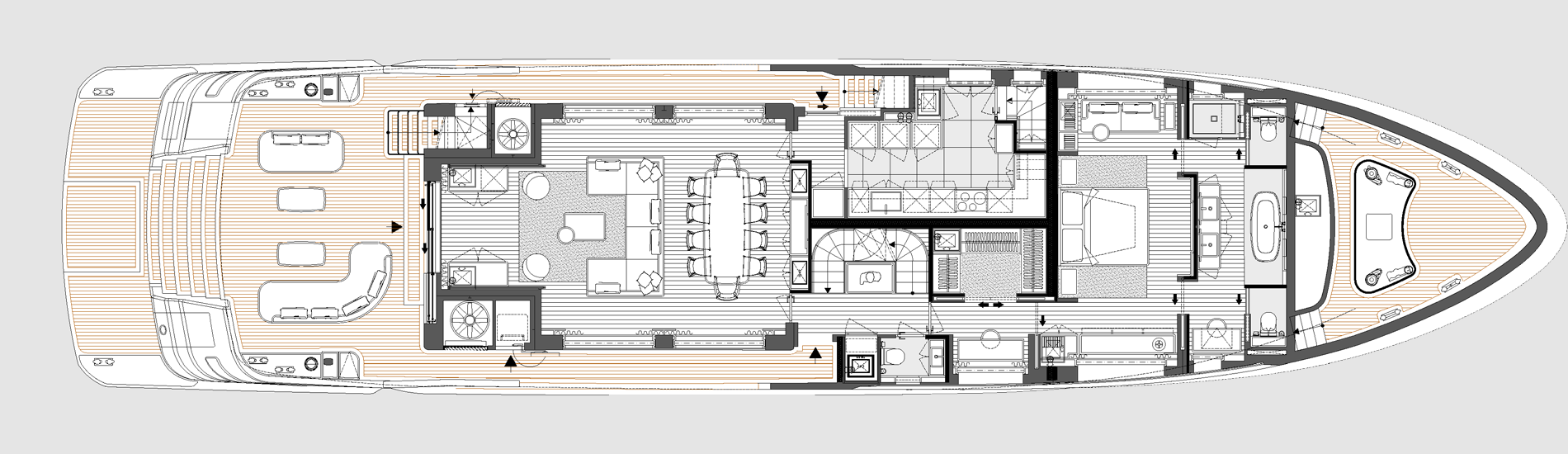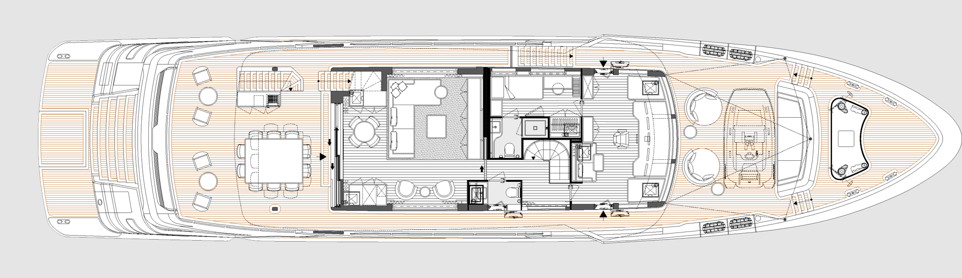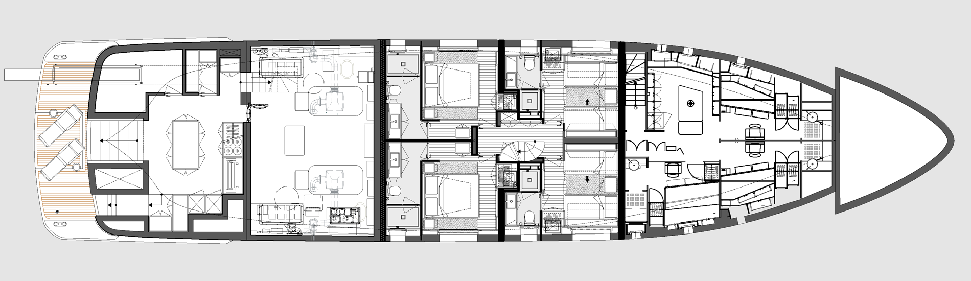 The RJ 115 project pays respect to the most exquisite yacht design tradition while implementing it with highly sophisticated design solutions. An extensive use of glass in the bulwarks and the open stern enhance the visual continuity with the surrounding environment. Stellamar’s profile is tense yet it encompasses sensuous lines that add an unrivalled elegance to her exterior design. With this project, Francesco Paszkowski shows that medium size dimensions are not the enemy of creativity as they make it more effective. Paszkowski succeeded in providing the 35m yacht with large spaces and luxury amenities while staying true to her explorer yacht’s soul.